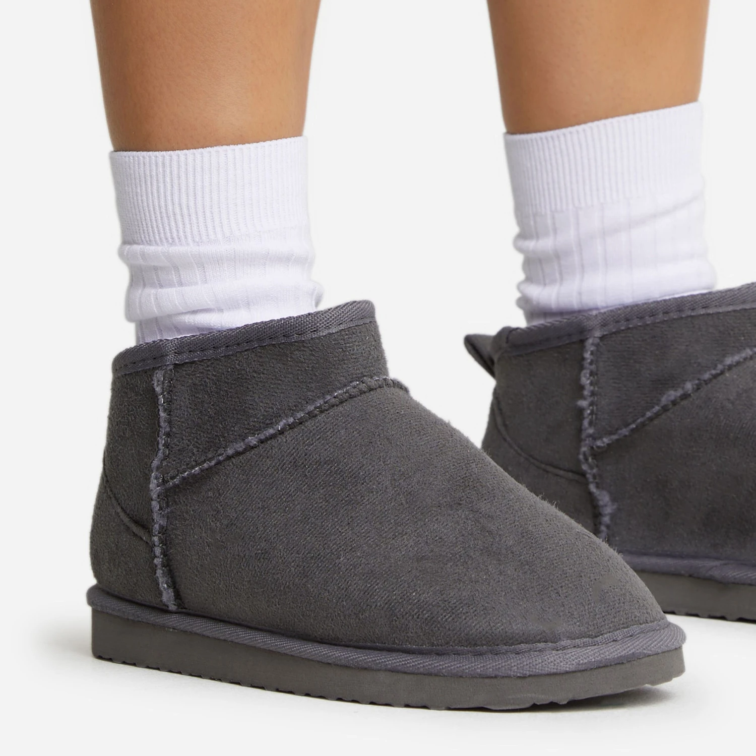 Earn some serious style points with these boots doll. Featuring a grey faux suede material, faux fur lining and a mini ankle length, what’s not to love?