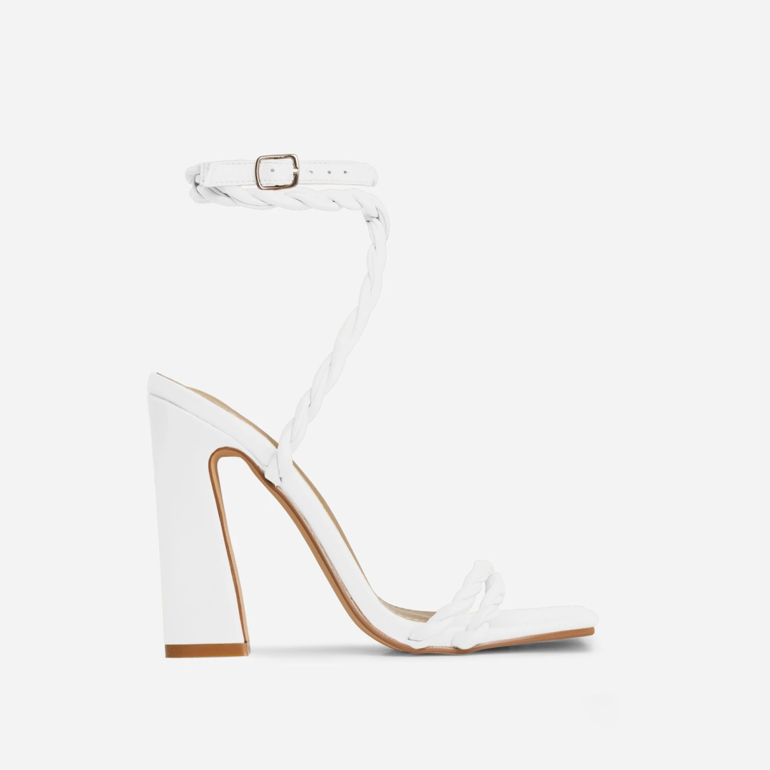 Girl, your heel collection just got a whole lot better with these dreamy heels. Featuring a white faux leather material, with double twisted strap detailing, a square toe and a flared block heel.