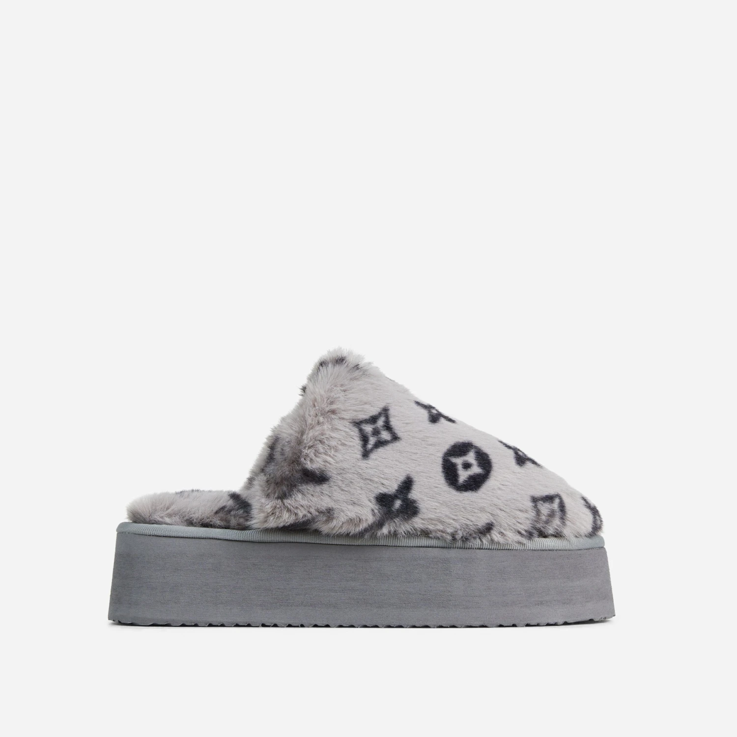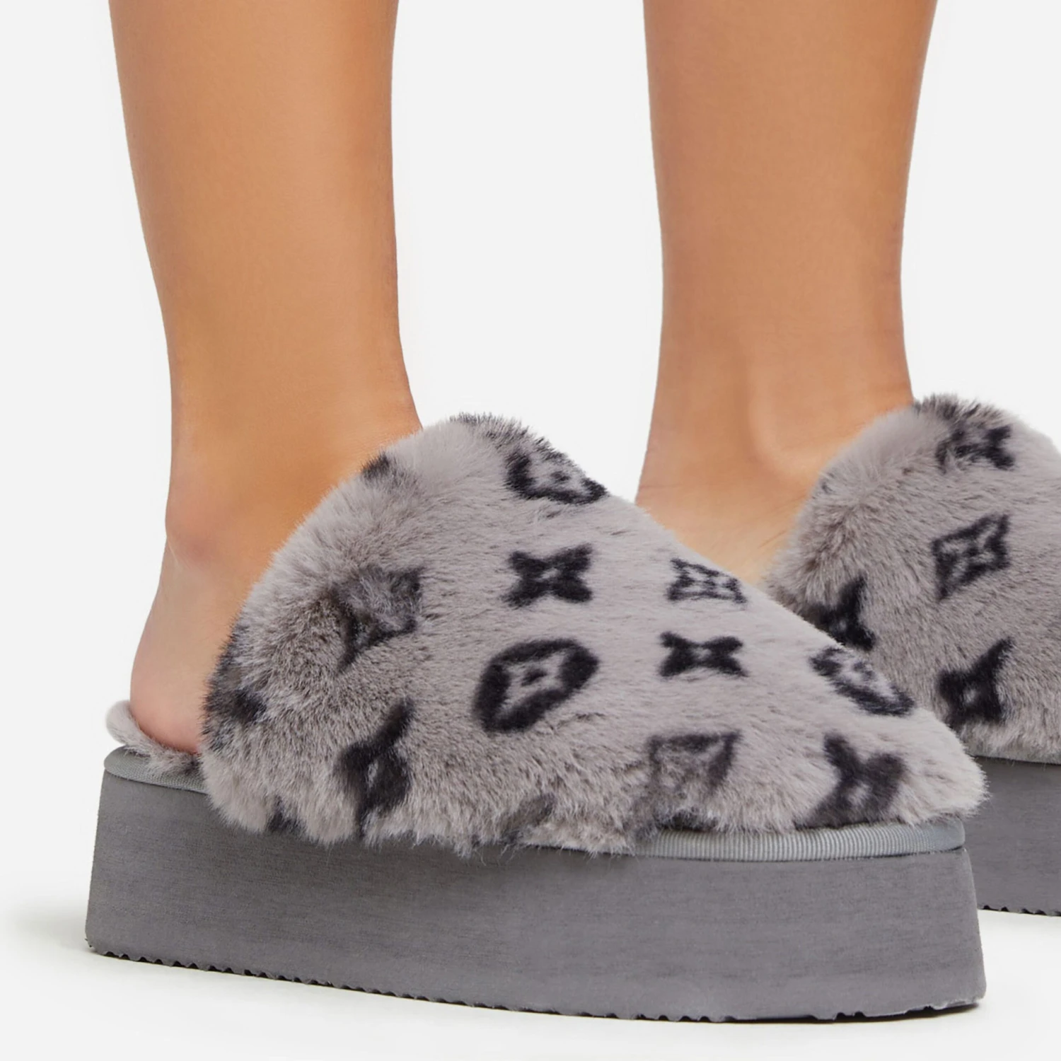 Girl, your slipper wardrobe just went up a level. Featuring a grey faux fur material, with printed detailing, a closed toe, flatform sole and a slip on design.