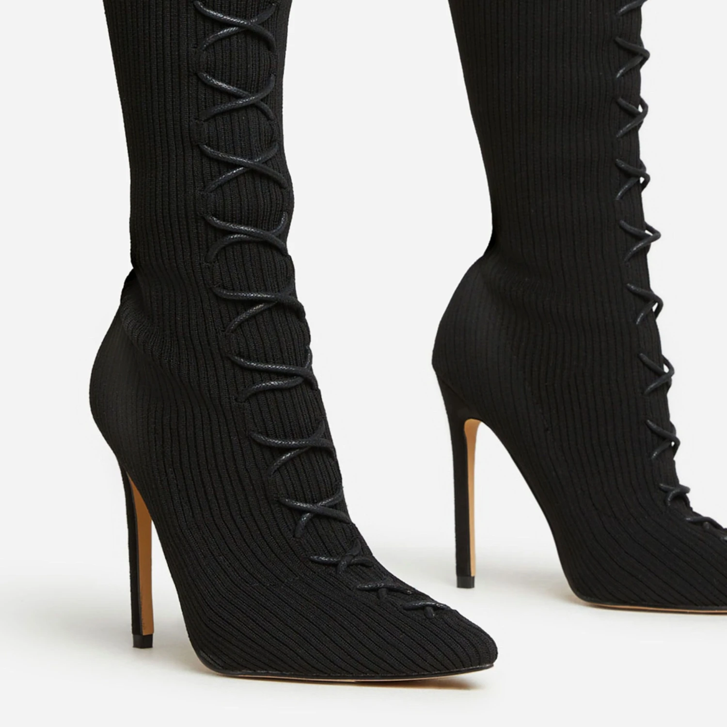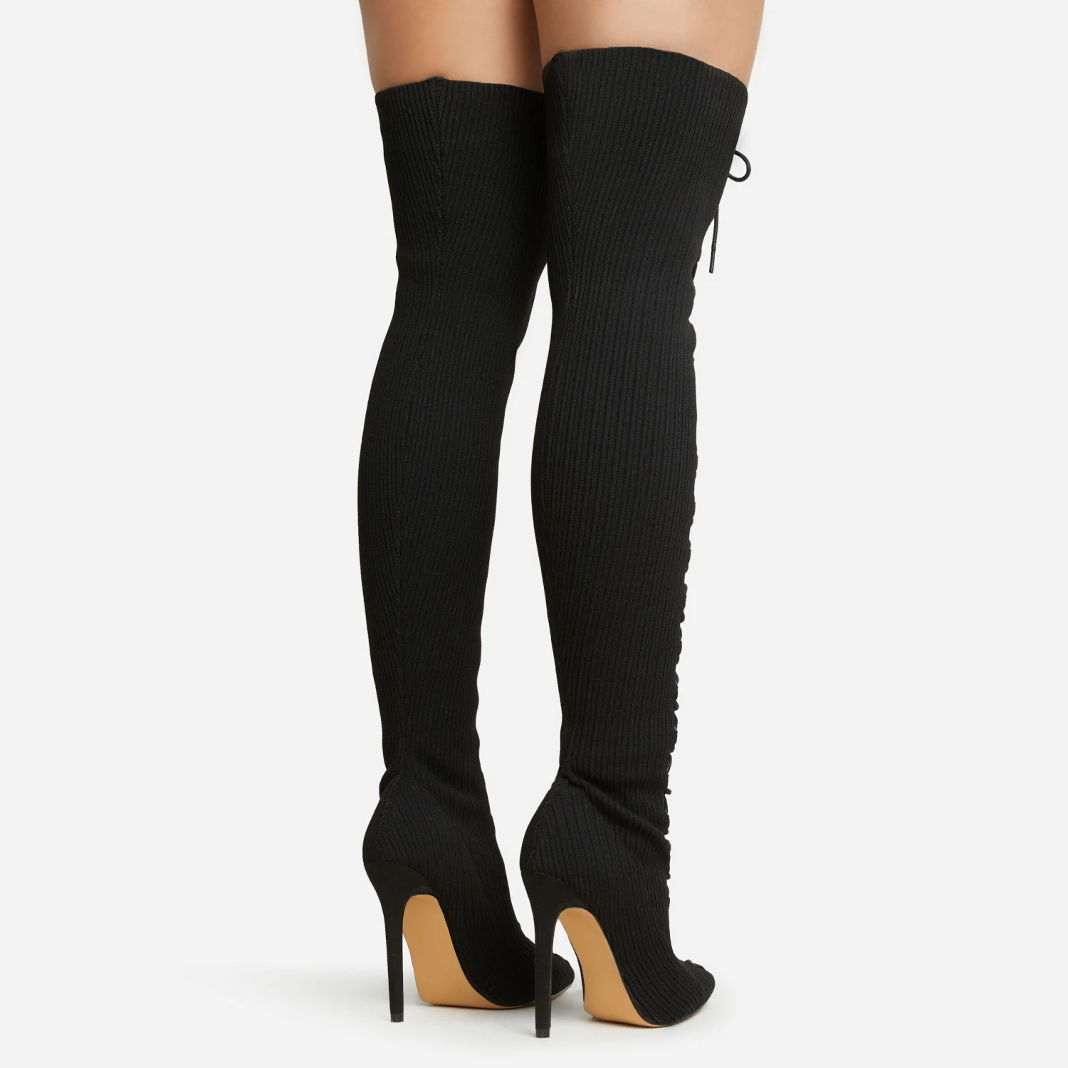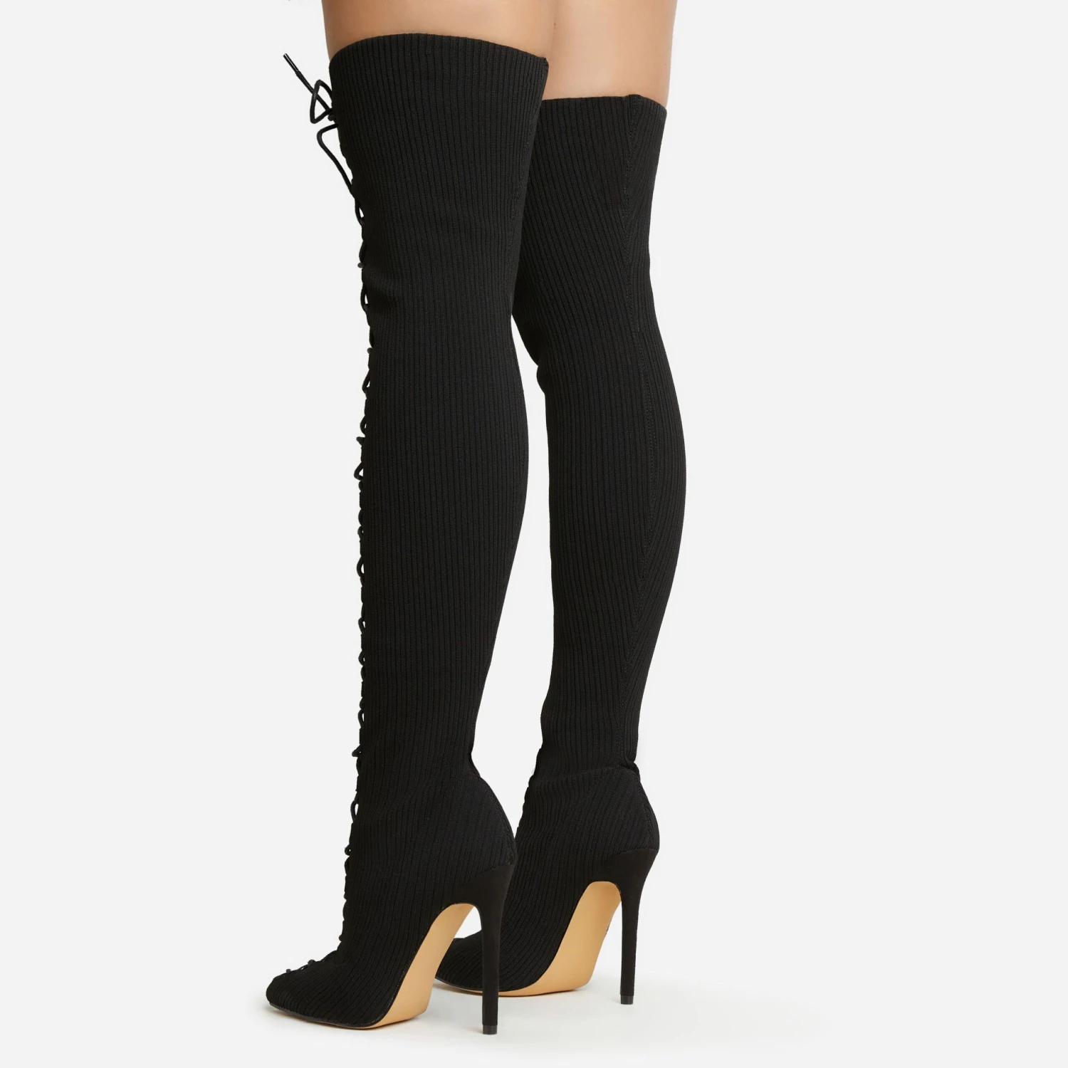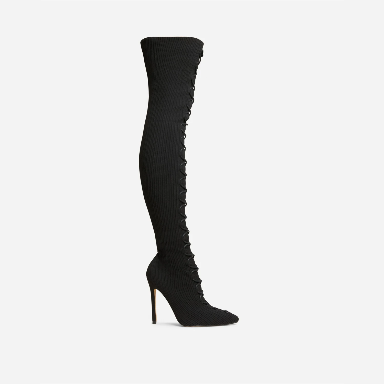 Make them stop and stare doll. Featuring a black ribbed knit material, a thigh high length, a lace-up design and a stiletto heel.