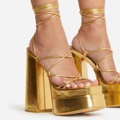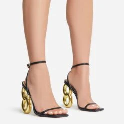 EGO Farah Ankle Strap Square Toe Gold Chain Heel In Black Faux Leather