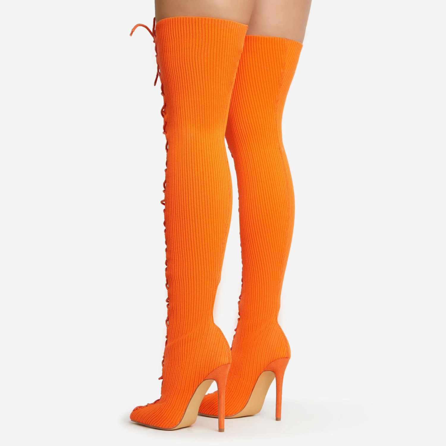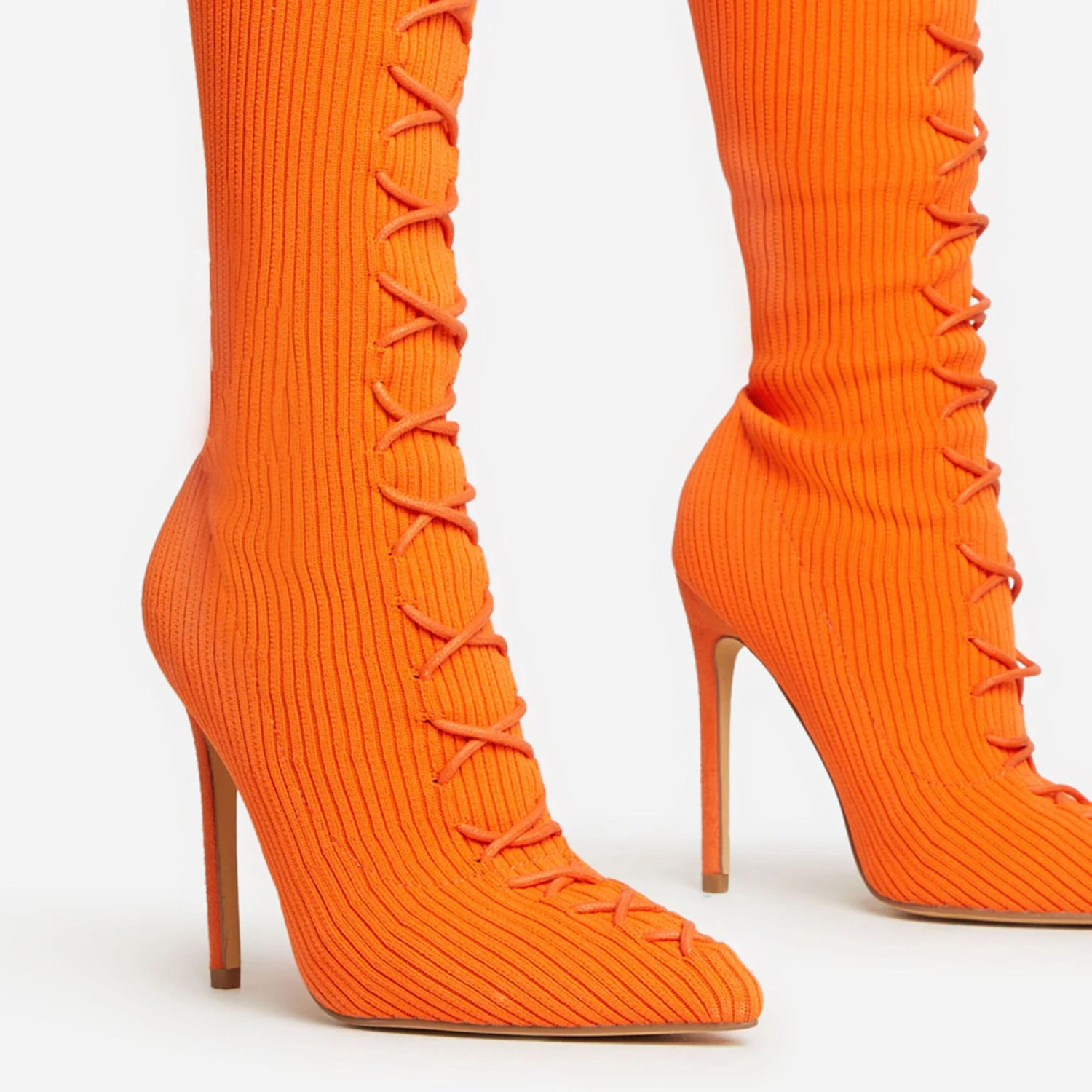 Be the centre of attention with these heels doll. Featuring an orange ribbed knit material, a thigh high length, a lace-up design and a stiletto heel.