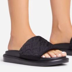EGO It’s-A-Vibe Embossed Velcro Strap Flat Slider Sandal In Black Lycra