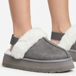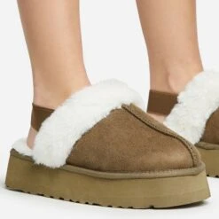 EGO Head-High Faux Fur Trim Sling Back Platform Slipper In Chestnut Brown Faux Suede