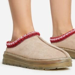 EGO Lil Aztec Detail Chunky Rubber Sole Faux Fur Lining Flat Slipper In Taupe Faux Suede