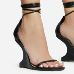 EGO Time-Flies Lace Up Square Toe Cut Out Wedge Heel In Black Faux Leather