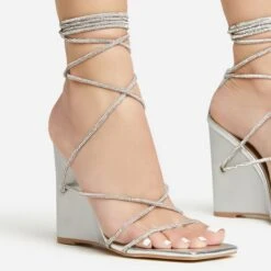 EGO Beggin Lace Up Diamante Strap Detail Square Toe Wedge Heel In Silver Faux Leather