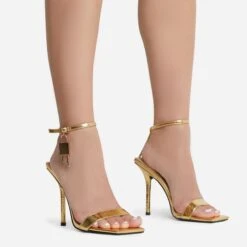 EGO Waves Lace Up Strappy Square Toe Flared Block Heel In Gold Croc Print Faux Leather
