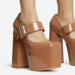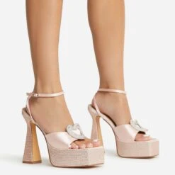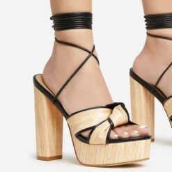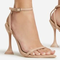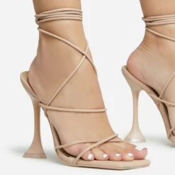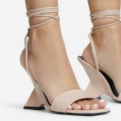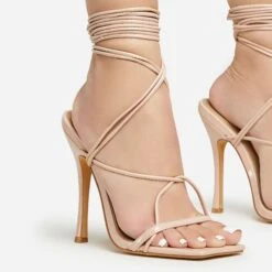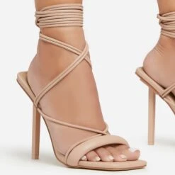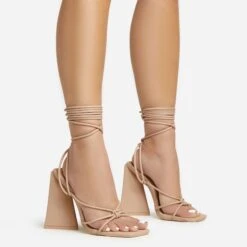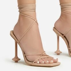 EGO Flamingo Lace Up Faux Feather Detail Square Toe Metallic Thin Block Heel In Nude Faux Leather