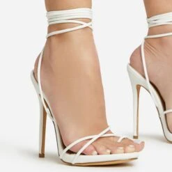EGO Flower-Child Lace Up Strappy 3D Flower Detail Square Toe Stiletto Heel In White Faux Leather