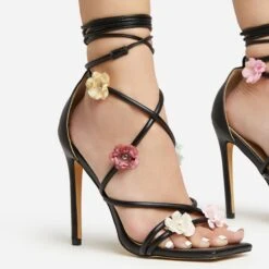 EGO Flower-Child Lace Up Strappy 3D Flower Detail Square Toe Stiletto Heel In Black Faux Leather