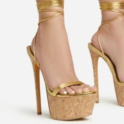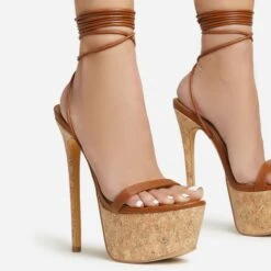 EGO Tour Lace Up Knotted Strap Cage Detail Square Toe Thin Stiletto Heel In Tan Brown Faux Leather