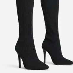 EGO Fierce Pointed Toe Stiletto Heel Over The Knee Thigh High Long Sock Boot In Black Ribbed Knit
