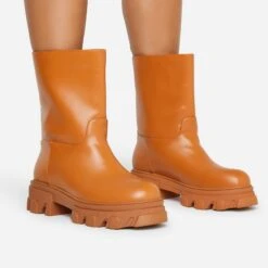 EGO Fifi Closed Square Toe Statement Platform Block Heel Ankle Biker Boot In Black Faux Leather