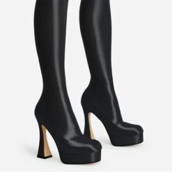 EGO Highland Square Toe Statement Metallic Heel Knee High Long Boot In Cream Croc Print Faux Leather