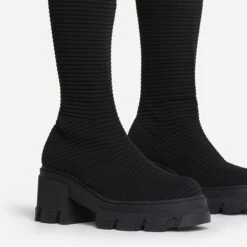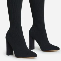 EGO No-Scrubs Lace Up Square Closed Toe Block Heel Over The Knee Thigh High Long Boot In Black Lycra