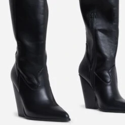 EGO Pony-Club Pointed Toe Low Block Heel Knee High Long Western Cowboy Boot In Black Faux Leather