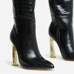 EGO Role-Play Pointed Toe Cut Out Metallic Heel Knee High Long Boot In Black Croc Print Faux Leather