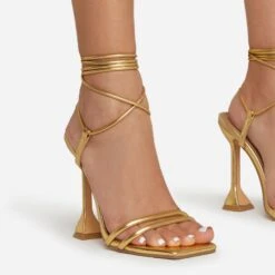 EGO Rose-Rouge Lace Up Clear Perspex Strap Square Toe Statement Metallic Heel In Beige Linen