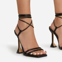 EGO Rosalia Lace Up Knotted Strap 3D Rose Detail Square Toe Stiletto Heel In Black Faux Leather