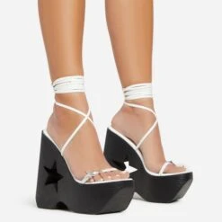EGO Sugar-Fire Diamante Bow Perspex Strap Square Toe Platform Flared Block Heel In Nude Patent